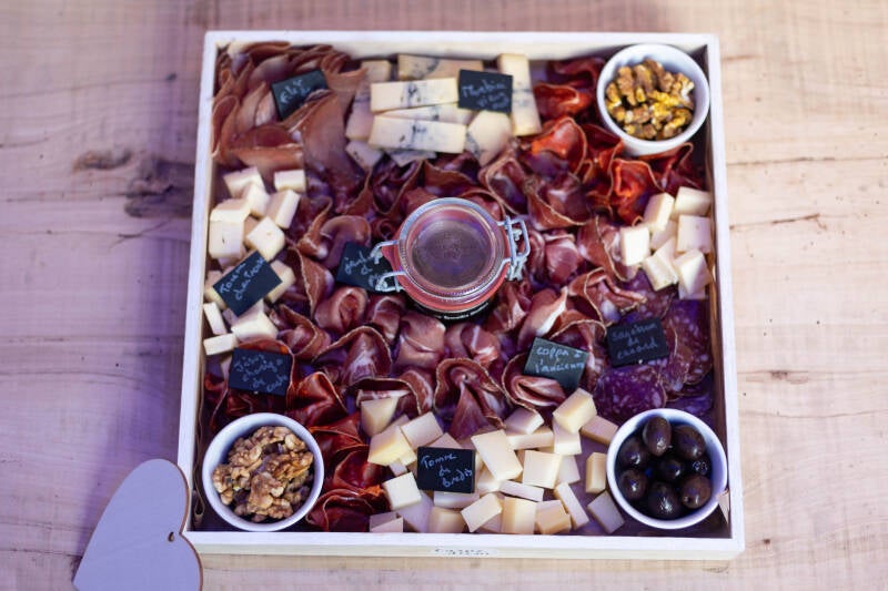 Planche repas (charcuterie, fromage, tartinable, dessert) + 1 bouteille de vin blanc ou rouge : 60 €
